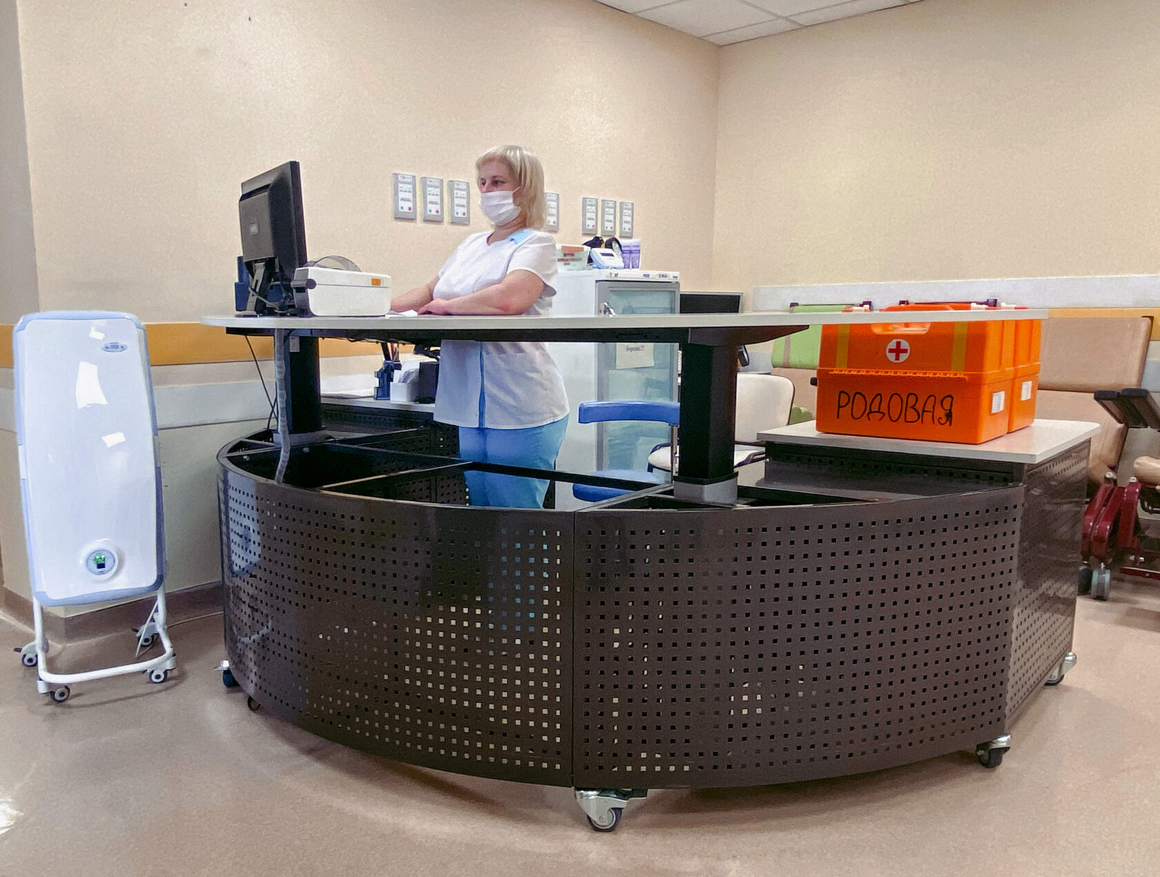 Стол также оснащен автоматическим механизмом поднятия столешницы, который позволяет осуществлять работу «сидя-стоя». Высота подъема столешницы до 1,5 м.